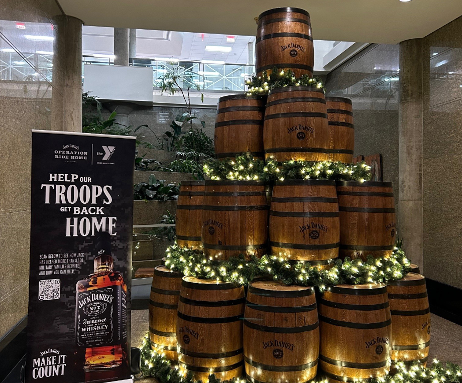 The Jack Daniel’s Barrel Tree is a tradition that started in 2011 at the Jack Daniel Distillery. 100% of the proceeds go to the Armed Services YMCA to support the Jack Daniel’s Operation Ride Home program, which helps bring our military home for the holidays.